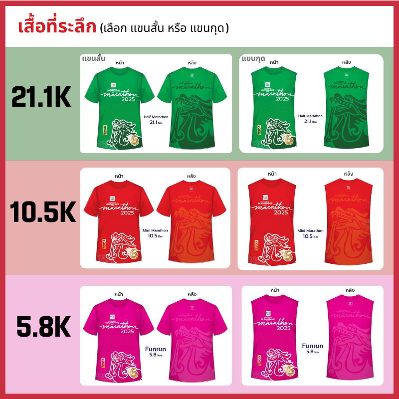 ค่าสมัคร 600 บาท จะได้รับเสื้อที่ระลึกสีแดง 1 ตัว (เลือก แขนสั้น หรือ แขนกุด) + (เหรียญรางวัล เมื่อเข้าเส้นชัย) - FUN RUN ระยะทาง 5.8 กม.