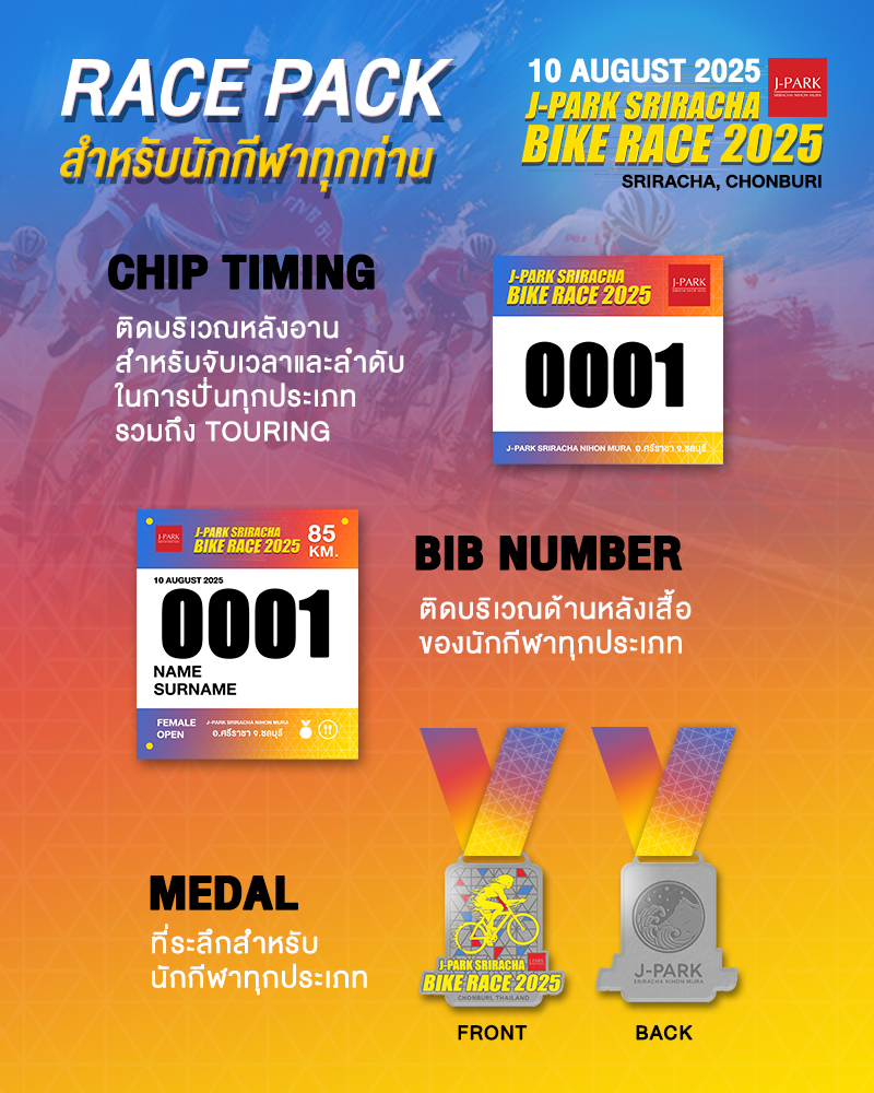 • Race pack (Bike Tag+Timing Chip/ BIB Number/ เหรียญที่ระลึก)
