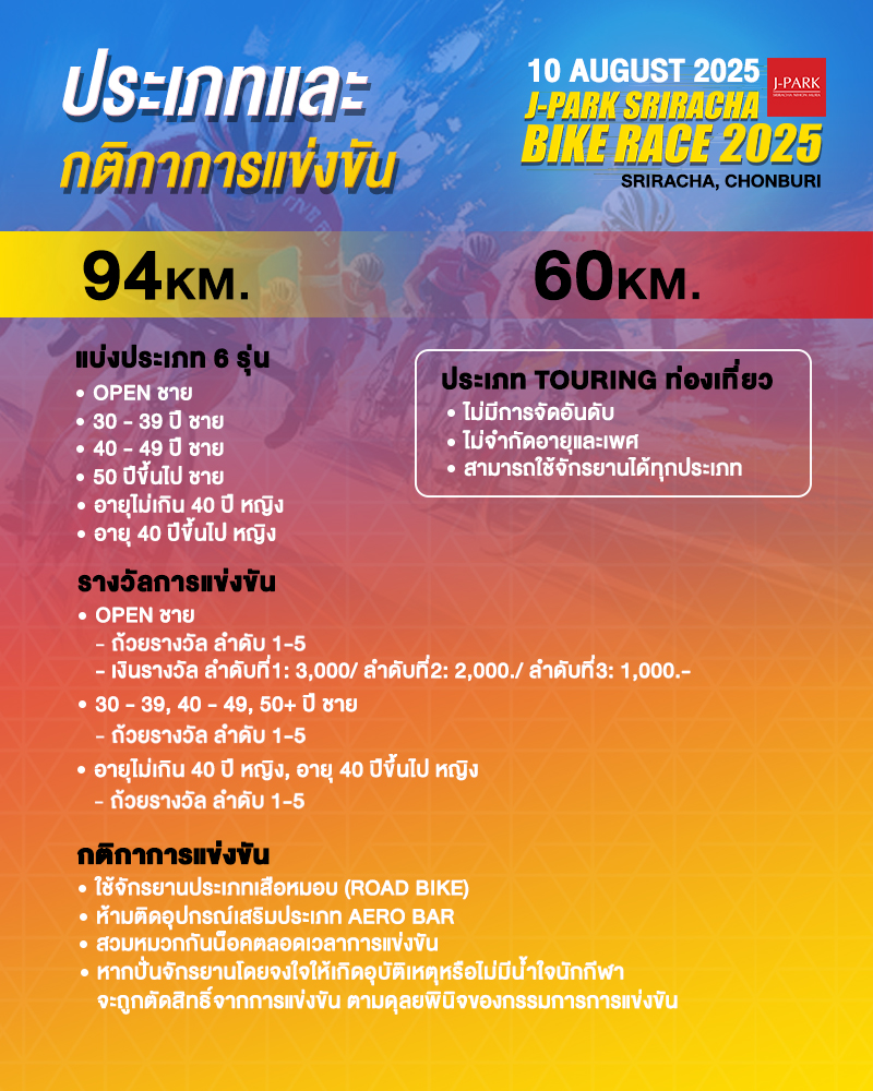 1. ประเภทแข่งขัน ระยะทาง 94 กิโลเมตร (จักรยานเสือหมอบเท่านั้น)