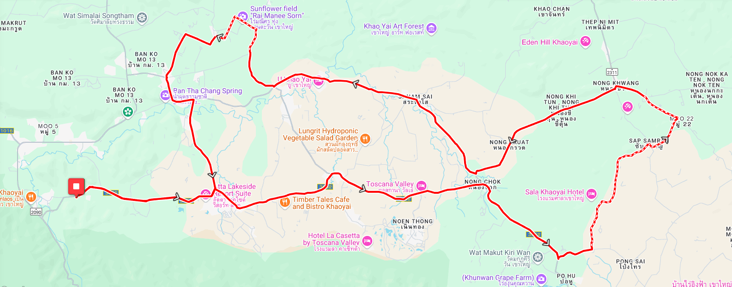 เริ่มต้นที่ ศูนย์การเรียนรู้การท่องเที่ยวเชิงนิเวศ ททท (TAT ECO PARK) ไปทาง ทอสคาน่า เลี้ยวซ้ายทาง องค์การบริหารส่วนตำบลโป่งตาลอง ผ่านวัดป่าภูหายหลง ผ่านบ้านหนองขวาง บ้านสระน้ำใส ไร่มณีศรทุ่งทานตะวันเขาใหญ่ วงเวียนเสาธงชาติบ้านไร่ วนมาออกแยกคลองดินดำ กลับทางเดิมจนถึงศูนย์การเรียนรู้การท่องเที่ยวเชิงนิเวศ ททท (TAT ECO PARK)