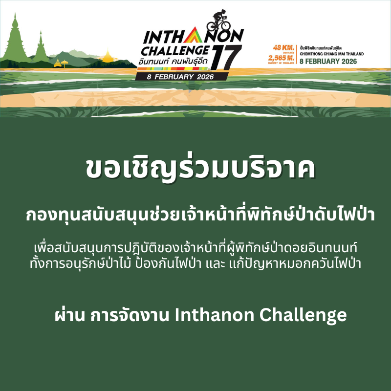 การรักษาป่าดอยอินทนนท์ คือ การรักษาป่าต้นน้ำให้คงอยู่คลอดไป ประชาชนทุกคนมีส่วนร่วมได้ โดยการสนับสนุนการปฎิบัติงานของเจ้าหน้าที่ผู้พิทักษ์ป่า ทั้งการอนุรักษ์ป่าไม้ และ ป้องกันไฟป่า แก้ปัญหาหมอกควันไฟป่า เชิญร่วมบริจาค ผ่าน การจัดงาน Inthanon Challenge