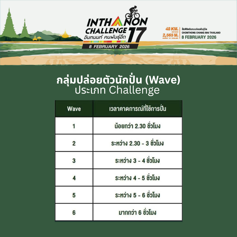 หมายเหตุ : การเลือกกลุ่มปล่อยตัว wave ควรประมาณการ เวลาที่จะใช้ในการปั่นจนครบระยะ ให้เหมาะกับตัวเอง ทั้งนี้ไม่ว่าจะลง wave ใด ระบบ Chip timing จะเริ่มจับเวลาเมื่อนักปั่นผ่านจุด Start และคำนวนเวลาปั่นเมื่อผ่านจุด Finish