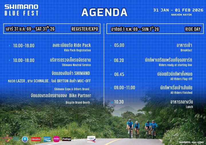 SHIMANO BLUE FEST 2026 จัดที่ วังรี รีสอร์ท (Wangree Resort) ลงทะเบียนรับ Ride Pack ในวันที่ 31/01/26 ภายในงานพบกิจกรรม Shimano Expo, Lazer helmets booth, Shimano Neutral Service,ทดลองอุปกรณ์เเละเทคโนโลยีล่าสุดจาก Shimano รวมถึงบูธ Bike Partner ชั้นนำอื่นๆอีกด้วย