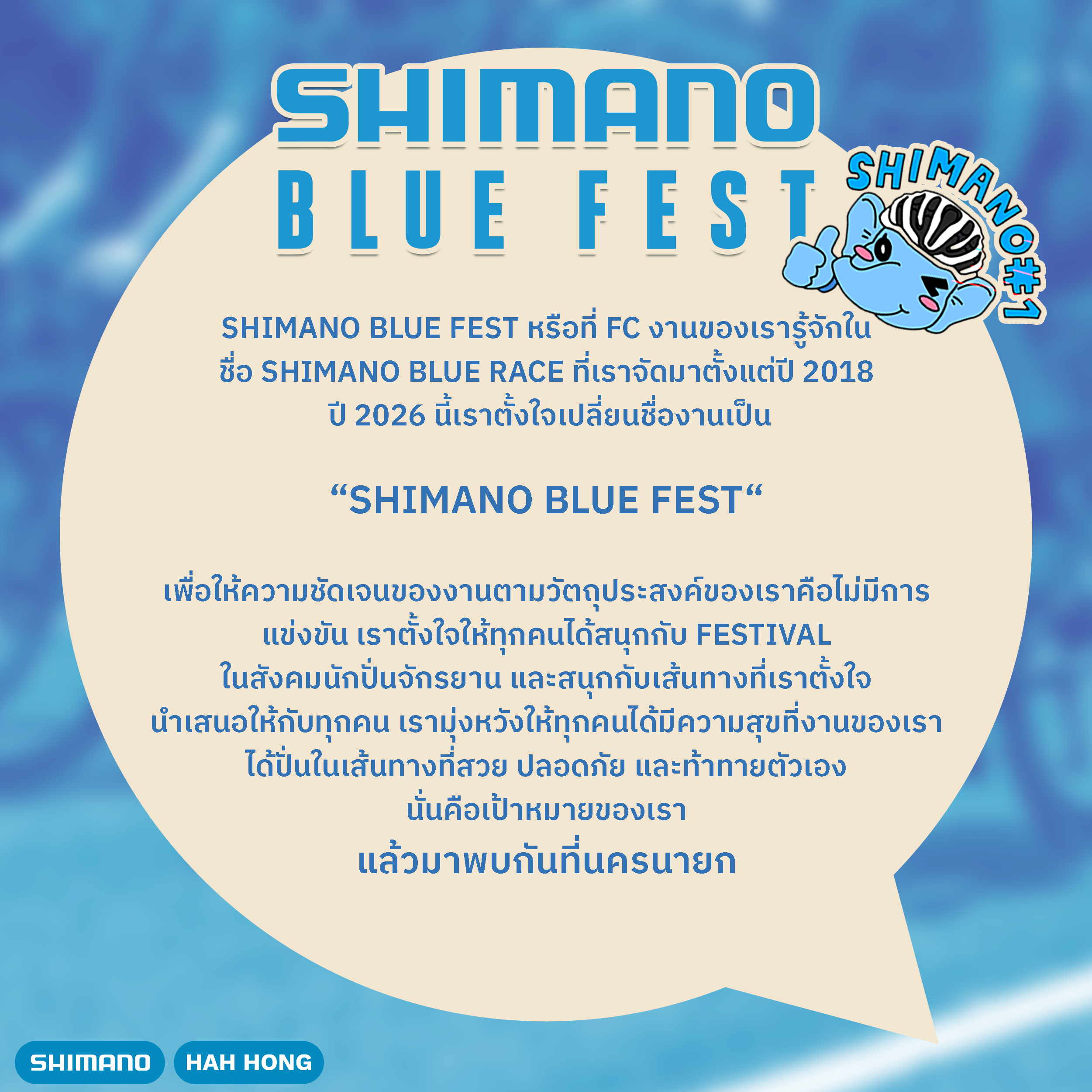 Shimano Blue Fest หรือที่ FC งานของเรารู้กันในชื่องาน Shimano Blue Race ที่เราจัดมาตั้งแต่ปี 2018 ปี 2026 นี้เราตั้งใจเปลี่ยนชื่องานเป็น Shimano Blue Fest เพื่อให้ความชัดเจนของงานตามวัตถุประสงค์ของเราคือไม่มีการแข่งขัน เราตั้งในให้ทุกคนได้สนุกกับ Festival ในสังคมนักปั่นจักรยาน และสนุกกับเส้นทางที่เราตั้งใจนำเสนอให้ทุกคน เรามุ่งหวังให้ทุกคนได้มีความสุขที่งานเรา ได้ปั่นในเส้นทางที่สวย ปลอดภัย และท้าทายตัวเอง นั่นคือเป้าหมายของเรา แล้วมาพบกันที่นครนายก