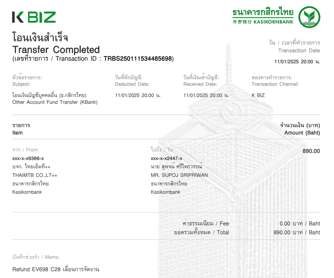 (ค่าบริการ และ ค่าธรรมเนียมต่างๆ จะไม่สามารถ refund ได้)